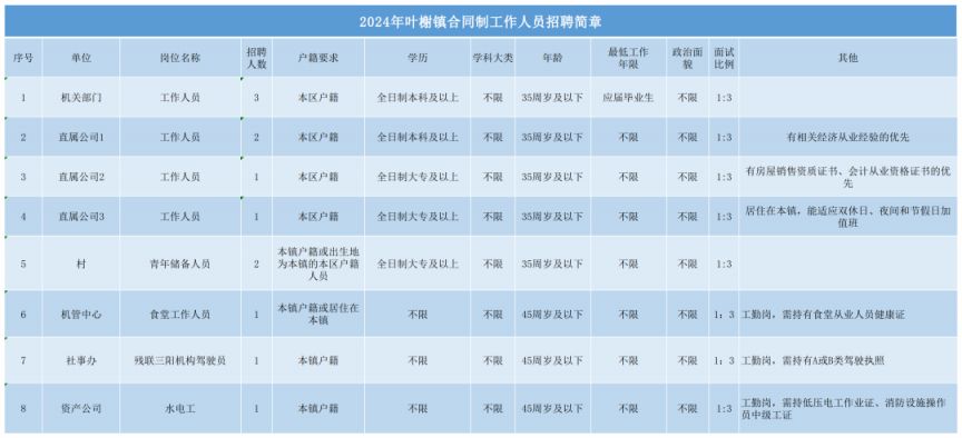 7、 符合报考具体岗位所列的其他要求。报考具体岗位所列的其他要求见《叶榭镇2024年合同制工作人员招聘简章》(见附件下载)。