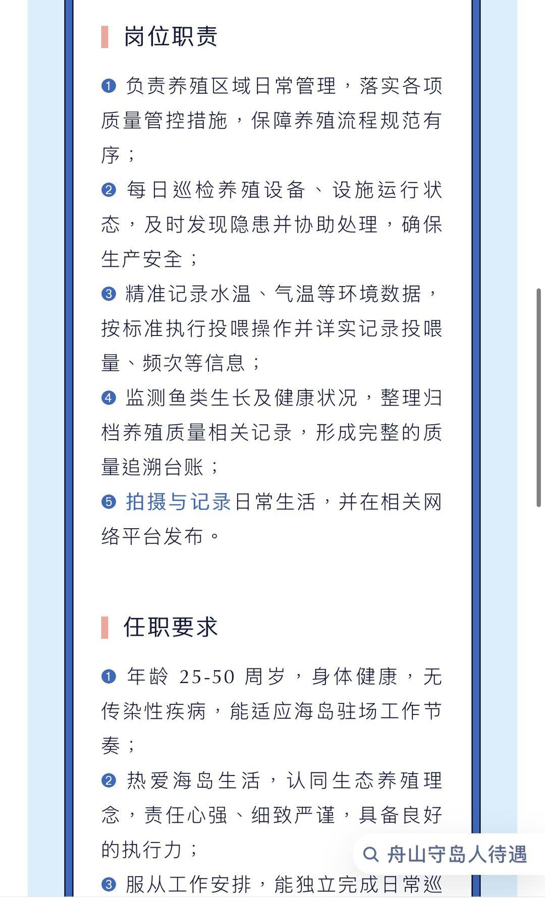 在这个招聘启事中注明,舟山岱山东寨岛大黄鱼围栏养殖基地坐落于风光旖旎的海岛之上,专注于深远海围栏生态鱼类养殖,现诚聘守岛人 2 名。要求负责养殖区域日常管理,每日巡检养殖设备、设施运行状态,精准记录水温、气温等环境数据,按标准执行投喂操作并详实记录投喂量、频次等信息;监测鱼类生长及健康状况,整理归档养殖质量相关记录,形成完整的质量追溯台账; 拍摄与记录日常生活,并在相关网络平台发布等等。这则招聘对学历没有要求。但年龄须在 25-50 周岁,身体健康,无传染性疾病,能适应海岛驻场工作节奏;热爱海岛生活,认同生态养殖理念,服从工作安排,能独立完成日常巡检、记录等工作,熟练使用专业摄影设备(单反/运动相机)、无人机航拍;能独立完成脚本策划、视频拍摄、剪辑、发布全流程。公司包食宿。