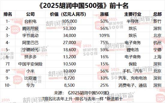 2月5日消息,胡润研究院2月5日发布了《2025胡润中国500强》,其中显示,台积电价值增长3.5万亿元,以10.5万亿元再度蝉联中国价值最高的民营企业。腾讯价值增长1.9万亿元,以5.3万亿元稳居第二。字节跳动价值增长1.8万亿元,以3.4万亿元保持第三,109%的涨幅也是前十断档第一。值得注意的是,小米首次进入榜单前十,价值增长3570亿元,以1万亿元位列第八,主要得益于小米汽车业务的爆发式增长以及手机高端化突破带来的盈利跃升。