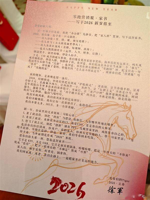 2月5日消息,5日中午,零跑汽车COO徐军在微博晒出“写给零跑营销服的家书”。其中提到,2026年要让灯继续亮,不过把光调成“护眼模式”:用高效让节奏慢半拍,让库存轻10斤、让政策少两行、让利润厚一寸。同时这封家书还曝光了领跑2026年的销量目标:“我们不做风暴,我们做风暴里的定海神针;我们不赌爆款,我们让每一款都爆得了,稳得住;我们不要太多,105万,多一台算我输”。