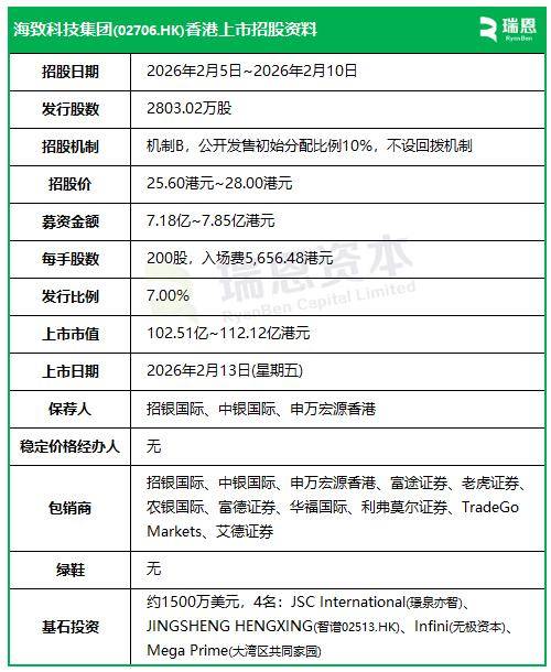 2月5日消息,来自北京经济技术开发区的海致科技集团,于5日起至下周二(2月10日)招股,预计2026年2月13日在港交所挂牌上市,招银国际、中银国际、申万宏源香港联席保荐。海致科技集团,计划全球发售2803.02万股H股(占发行完成后总股份的7%),其中90%为国际发售、10%为公开发售,无超额配股权。每股发售价介乎25.60港元~28.00港元,每手200股,入场费5656.48港元,最多募资约7.85亿港元。海致科技集团此次招股采用机制B,香港公开发售初始分配比例10%,不设回拨机制。